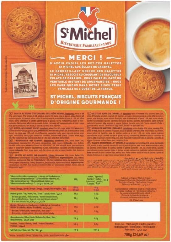 Wheat flour 48%, sugar, butter 20%, wheat starch, caramel chips 5% (sugar, glucose syrup, fresh cream, skimmed milk powder, salt, dextrose, natural vanilla flavouring), free range eggs 1.5%, salt, natural flavouring, caramelised sugar powder (caramel (glucose syrup, sugar), maltodextrin), skimmed milk powder, raising agent: ammonium carbonates. May contain traces of nuts and soya.