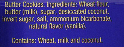Ingredients: wheat flour, sugar, butter 26%, grated coconut, raising agent (ammonium hydrogen carbonate), table salt, natural flavour, invert sugar syrup.