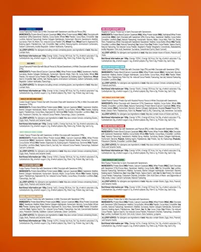 Protein Blend (Calcium Caseinate (Milk), Whey Protein Isolate (Milk)), Sweeteners: Maltitol, Sucralose; Bovine Collagen Hydrolysate, Humectant: Glycerol; Water, Palm Oil, Cocoa Butter, Whole Milk Powder, Fat-reduced Cocoa Powder (3%), Wheat Flour, Rapeseed Oil, Bulking Agent: Polydextrose; Wheat Starch, Emulsifier: Soy Lecithin; Salt, Raising Agents: Ammonium Carbonates, Sodium Carbonates; Acidity Regulator: Sodium Hydroxide; Flavourings.