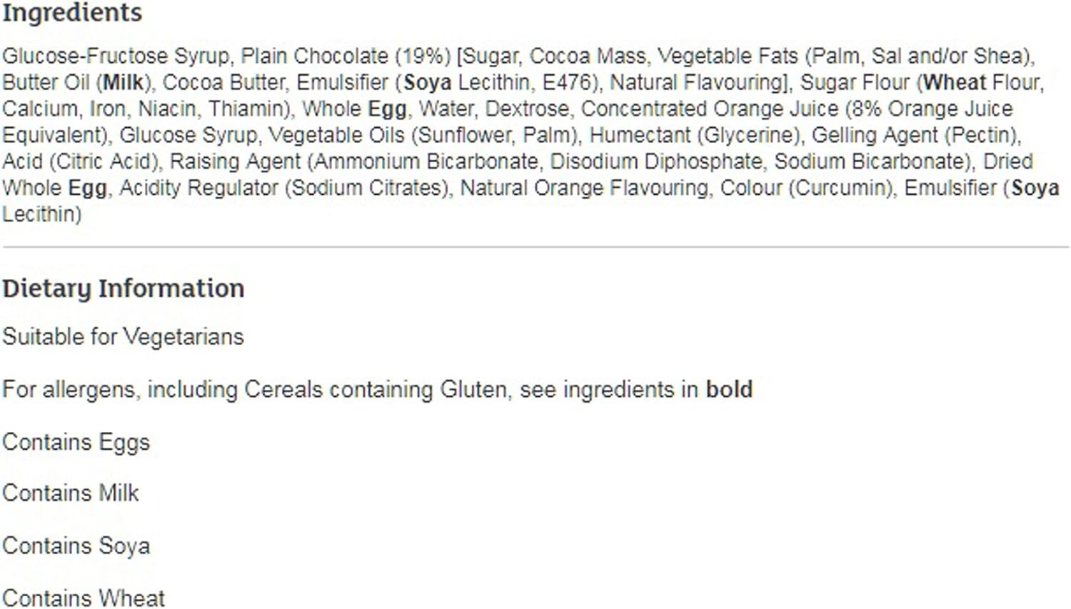 Glucose-Fructose Syrup, Plain Chocolate (19%) [Sugar, Cocoa Mass, Vegetable Fats (Palm, Shea), Butter Oil (MILK), Cocoa Butter, Emulsifiers (SOYA Lecithin, E476), Natural Flavouring], Sugar, Flour (WHEAT Flour, Calcium, Iron, Niacin, Thiamin), Whole EGG, Water, Dextrose, Concentrated Orange Juice (8% Orange Juice Equivalent), Glucose Syrup, Vegetable Oils (Sunflower, Palm), Humectant (Glycerine), Gelling Agent (Pectin), Acid (Citric Acid), Raising Agents (Ammonium Bicarbonate, Disodium Diphosphate, Sodium Bicarbonate), Dried Whole EGG, Acidity Regulator (Sodium Citrates), Natural Orange Flavouring, Colour (Curcumin), Emulsifier (SOYA Lecithin).