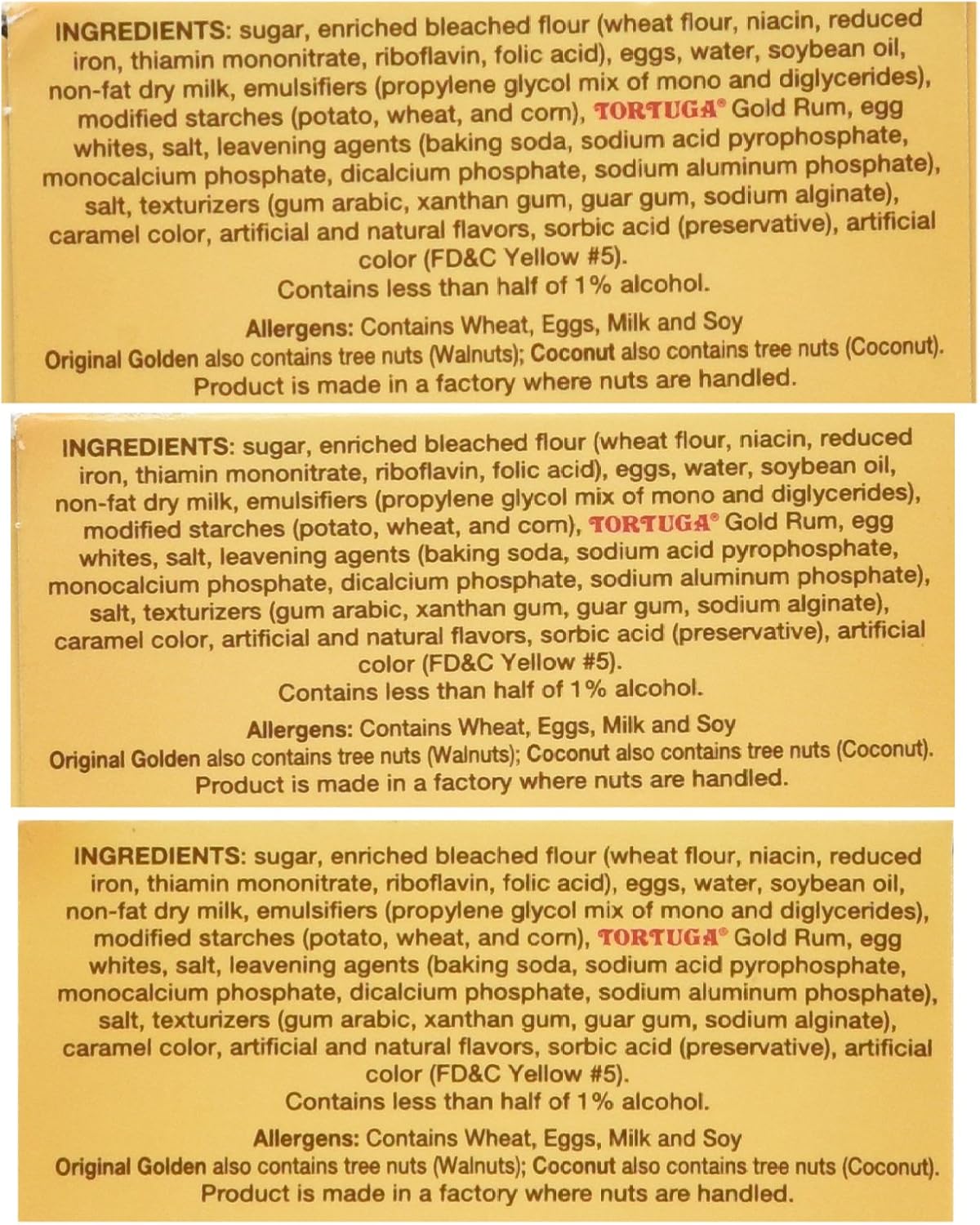 sugar, enriched bleached flour (WHEAT flour, niacin, reduced iron, thiamin mononitrate, riboflavin, folic acid), EGGS, water, SOYbean oil, non-fat dry MILK, emulsifiers (propylene glycol mix of mono and diglycerides), modified starches (potato, WHEAT, and com), tortuga" Gold Rum, EGG whites, leavening agents (baking soda, sodium acid sodium aluminum sugar, enriched bleached flour (WHEAT flour, niacin, reduced iron, thiamin mononitrate, riboflavin, folic acid), EGGS, water, SOYbean oil, non-fat dry MILK, emulsifiers (propylene glycol mix of mono and diglycerides), modified starches (potato, WHEAT, and com), tortuga" Gold Rum, EGG whites, salt, leavening agents (baking soda, sodium acid pyrophosphate, monocalcium phosphate, dicalcium phosphate, sodium aluminum phosphate), salt, texturizers (gum arabic, xanthan gum, guar gum, sodium alginate), caramel color, artificial and natural flavors, sorbic acid (preservative), artificial color (fd&c Yellow #5).