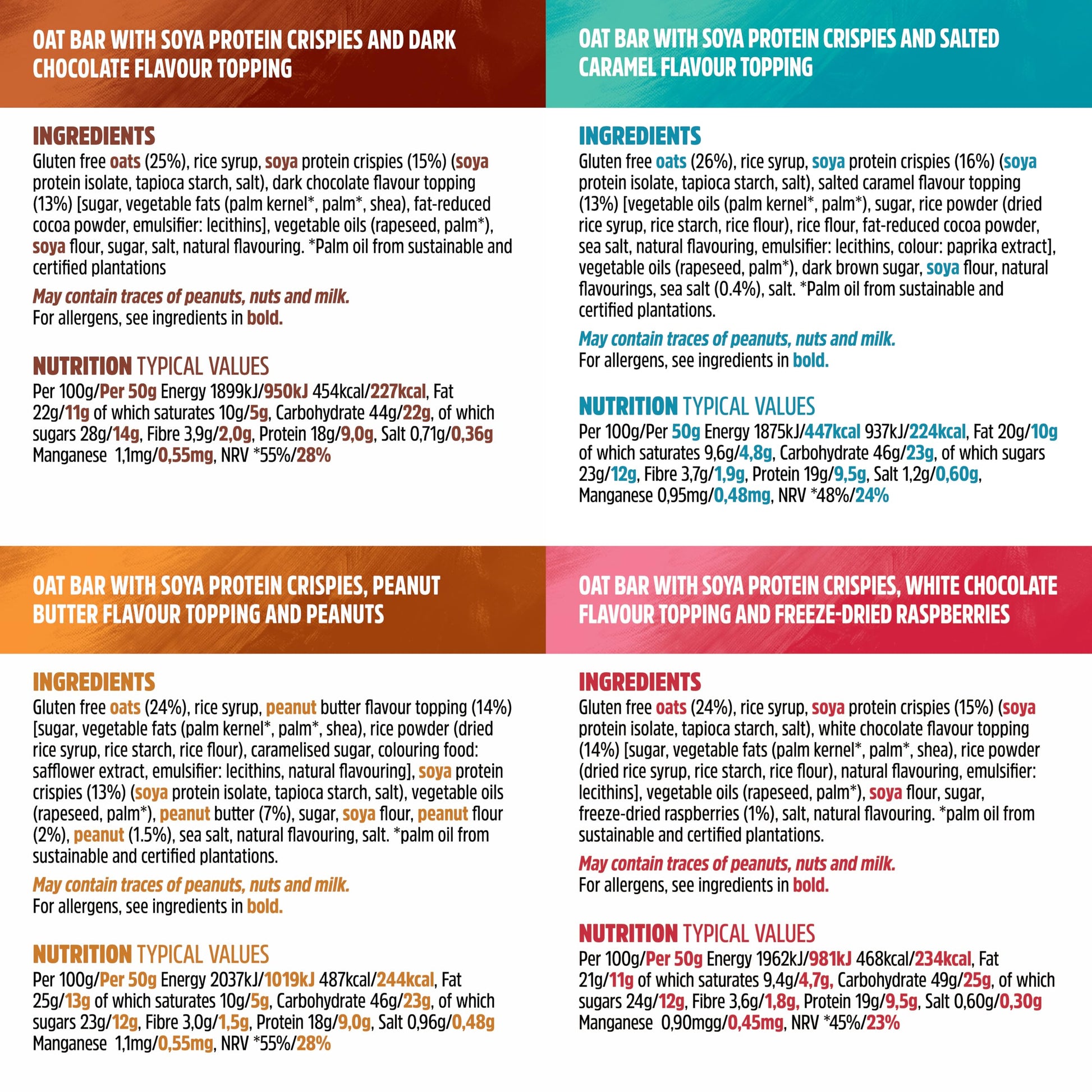 Gluten free OATS (25%), rice syrup, SOYA protein crispies (15%) (SOYA protein isolate, tapioca starch, salt), dark chocolate flavour topping (13%) (sugar, vegetabie fats (palm kernel, palm, shea), fat-reduced cocoa powder, emulsifier (lecithins)), vegetabie oils (rapeseed, palm), SOYA flour, sugar, sait, natural flavouring, Palm oil from sustainable and certified plantations